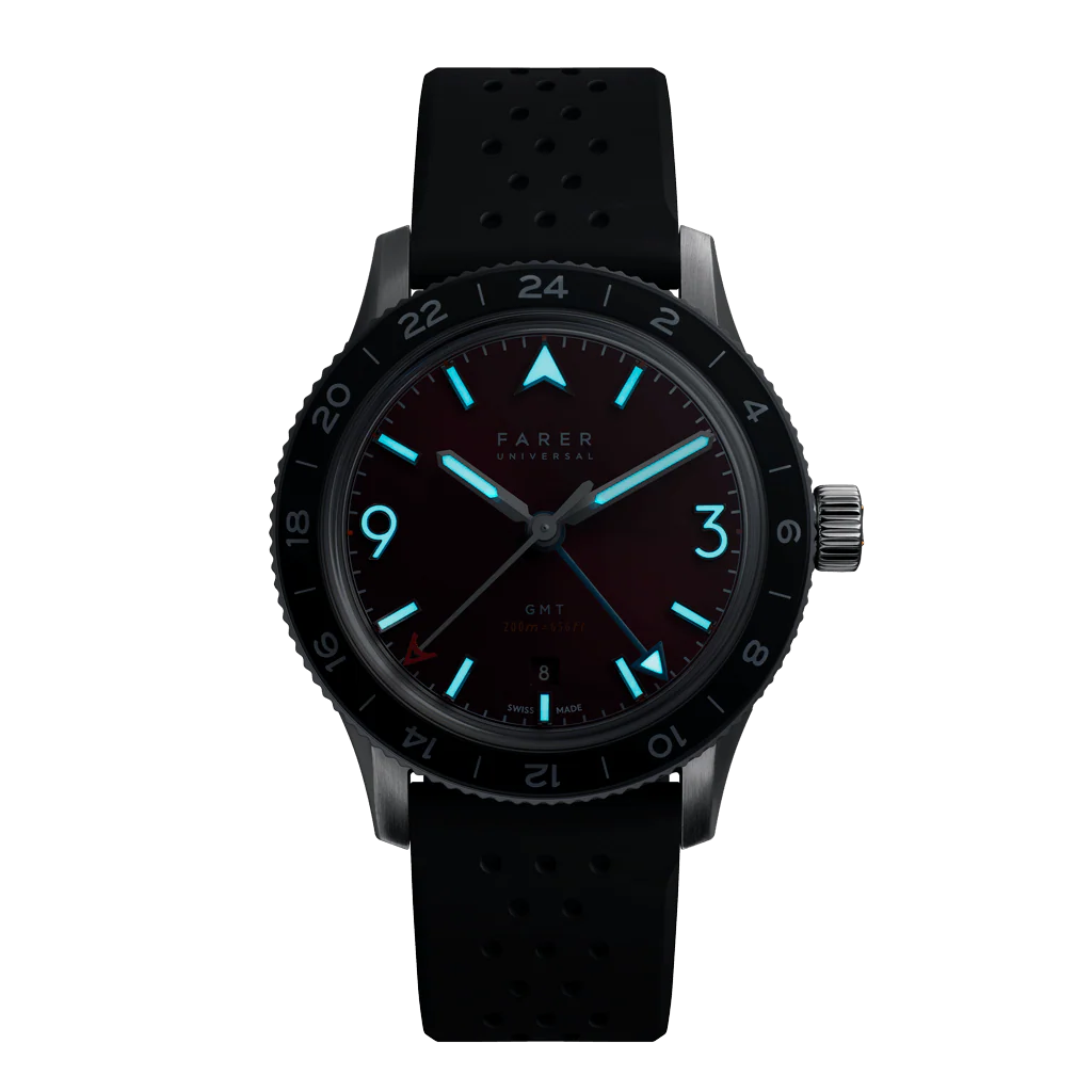 GMT watch with bidirectional rotating bezel with a black sapphire insert. Deep red sunburst dial and applied markers.