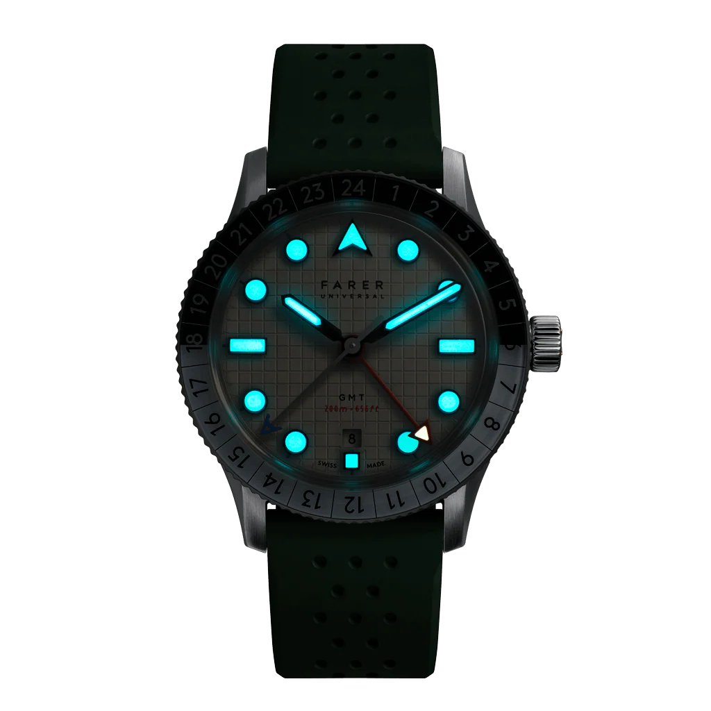 GMT watch with bidirectional rotating bezel with a black and white sapphire insert. Black hands and black and blue markers.