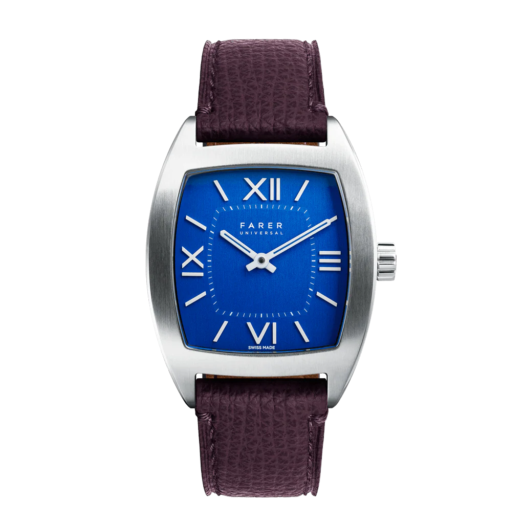 Automatic two-hand watch with tonneau-shaped case, blue dial, and choice of strap.